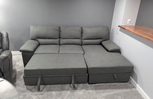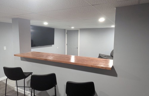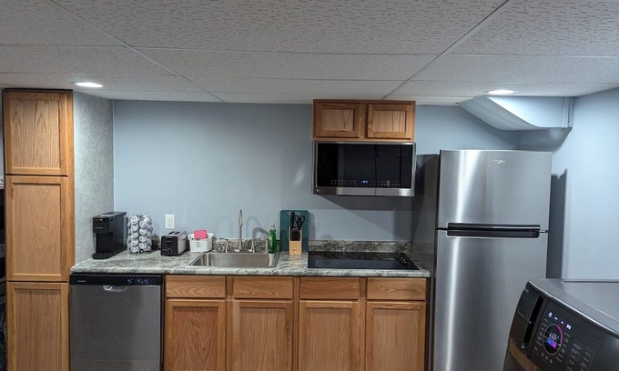 Enjoy a peaceful stay at this adorable 1-bedroom Basement Apartment in Kearney. This wonderful property features a cozy bedroom with an adjustable king bed perfect for relaxing. The bathroom is equipped with a refreshing shower. In addition, there is an additional space in the form of a living room with a comfortable sofa bed. You'll find all the necessary amenities like a full kitchen, dining room, full bath, washer/dryer combo, & Wi-Fi. Whether you're exploring the city or simply relaxing indoors, we hope you'll enjoy your stay at our tremendous Apartment. There are stairs on the property to get down too the apartment.