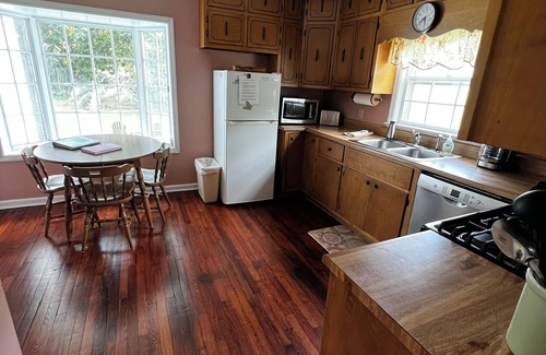 Our eat in kitchen with new gas stove is fully equipped to satisfy your cooking needs. Sit at the table and watch the river go by as you enjoy a meal or play a game of cards! This is a favorite spot for many visitors.