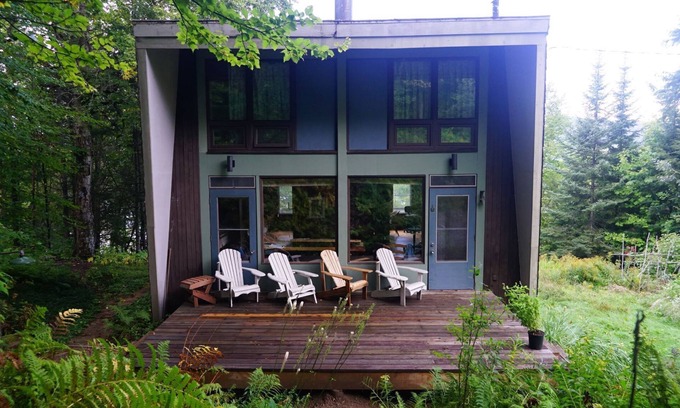 A cozy modernist lakeside cottage with incredible views - 3 bedrooms with full bath, and living room sofa pulls out as an additional queen, with a powder room nearby. There's a big open fireplace, and new triple-glazed windows make the house very comfortable in winter. For working from home there's a desk in the master bedroom and downstairs.
