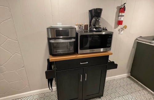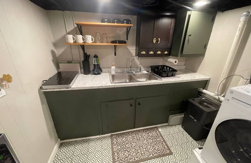 -Dining Area: Eat in kitchen with portable oven (cooks 7lb turkey), induction stove (Direction on usage of stove and oven available in apartment binder), refrigerator, microwave, and coffee brewer. Refrigerator has a BRITA filter pitcher for your convenience. Stocked with cutlery, plates, bowls, coffee cups and glasses. Feel free to use whatever you see around the kitchen, condiments, tea, coffee, etc.