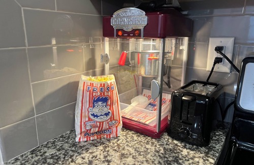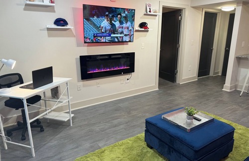 Welcome to your home away from home, just 1 mile from Truist Park Stadium! Step into our unique one-bedroom unit, designed as a Hall of Fame museum, perfect for sports enthusiasts and travelers seeking a memorable stay. As you enter, you'll be greeted by a cozy living room adorned with baseball memorabilia, featuring a 50-inch TV and an electric fireplace for relaxing nights in. Sink into the comfy couch after a day at the ballpark or exploring the nearby city of Atlanta. Adjacent to the living room is the fully equipped kitchen, complete with everything you need to whip up your favorite meals, including a popcorn machine for that authentic game day experience. Enjoy your culinary creations in the dining space or take it outside to the patio for some fresh air and comfort. The bedroom promises restful nights on a plush king bed, with a second 50-inch TV mounted on the wall for your entertainment. The ensuite bathroom features a shower and tub combination, offering a perfect spot to unwind after a busy day. For added convenience, the unit includes a washer and dryer, making it ideal for longer stays. Whether you're in town for a game, a concert, or simply exploring Atlanta, our Hall of Fame-themed unit provides the perfect blend of comfort and excitement. You'll be just steps away from some of Atlanta's best restaurants, shopping, and entertainment. Whether you're a sports fan, foodie, or someone looking to explore the local culture, there's plenty to see and do near Truist Park.