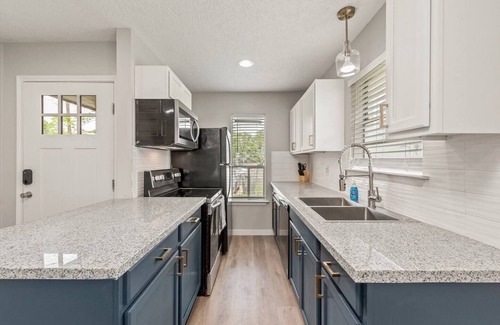 This space is designed and set up for guests' enjoyment. Take advantage of our fully stocked kitchen with brand-new stainless-steel appliances. The open concept living room allows for easy, memorable gatherings with loved ones. Whether your intentions are to relax or work, rest is important. We have equipped the unit with state-of-the-art beds, and linens. High speed Wi-Fi for our traveling professionals, and or our casual Netflix watchers.
