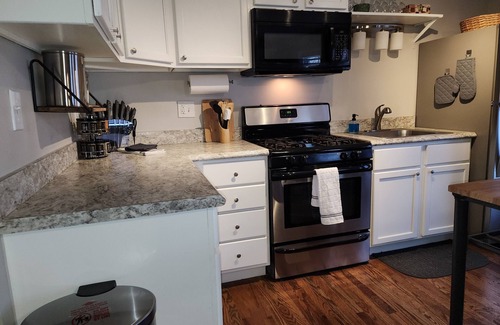 All new cookware, dishes, kuerig, a French press, rice steamer, instaPot, blender. The bike path is just 3 blocks away. We provide bikes! Can sleep up to 6 via Queen air mattress (or couch, not a sleeper) for 5th and 6th guest. Free parking, Strong WIFI, coin laundry available. Lovely, safe residential neighborhood!