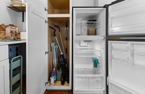 The living room and kitchen/dining are open concept, and there is a small breakfast nook with storage by the other front window. The kitchen has full sized appliances with a fridge, hood vent, and all small appliances that you may need (toaster, microwave, blender, etc).