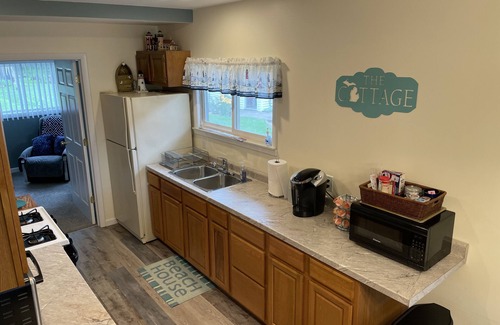 Cottage can sleep up to 5 with 2 bedrooms with queen beds and a full size futon in the living room. All linens, paper products and coffee are provided. In the kitchen you will find a full size refrigerator, gas stove with oven, microwave, toaster oven, toaster, and coffee pot along with pots, pans and dishes.
