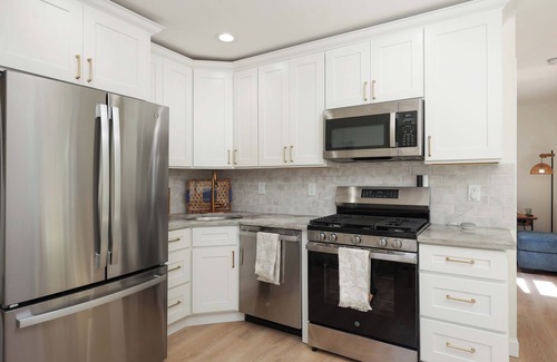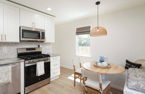 Welcome to your Long Branch getaway! This charming 2-bedroom, 1-bath home is the perfect blend of modern comfort and convenience. The property features heating, air conditioning, a washing machine, and WiFi to ensure a stress-free stay. The interior boasts cherry grey vinyl floors and an eat-in kitchen with built-in seating, quartz countertops, soft-close cabinets, and stainless steel appliances. The beautifully sized bedrooms include one with a bunk bed, featuring a full-size bed, a twin bed, and a pull-out trundle. Relax in the cozy living room with a 55-inch TV, and take advantage of the unfinished basement, which houses laundry facilities. Step outside to a fully enclosed yard, complete with plenty of outdoor seating, a patio table, a grill, and an outdoor shower—perfect for enjoying the fresh air. The front of the home offers a welcoming entrance with lovely pavers and parking for two cars. Located just 3 blocks from Pier Village, this comfortable and well-appointed home will make you feel right at home during your stay in Long Branch.