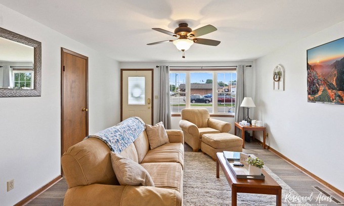 Sweet cozy 2 bedroom home with a 65" Smart tv in living room with 55" Smart tv's in bedrooms along with a fully fenced in backyard with barbeque grill{we supply charcoal, lighter and fluid) with outdoor patio table & chairs with shade umbrella that is stored in the garage. The kitchen has everything you need for cooking and eating. The home also has a one-car attached garage. Home is walking distance to Olivet Nazarene University. You are close to restaurants, shopping, movie theatre and the JP Sports complex. We offer all amenities to make sure that you have an enjoyable stay. You can enjoy a cookout in the back yard with a barbeque grill before or after taking a bike ride with the bikes that we also supply to the nearby bike paths along the KKK river. Perry Farm park is just minutes away. The home is a two bedroom one bath home with a huge walk-in shower. We state the the home sleeps six because we also have a deluxe queen electric air mattress that is stored in the bedroom closet that can be blown up in less than 3 minutes. There are also extra sheets, pillows and blankets in the closet shelves and in bottom dresser drawers. For the little ones we have a pack-in-play and a high chair in the home.