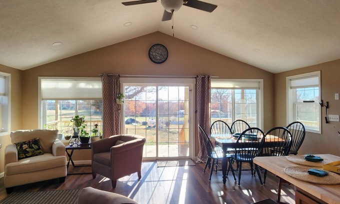 Beautiful, cozy new home in secluded country setting. A perfect retreat or get-away for a couple or family. Gorgeous views nestled amidst two ponds, walking trails, chapel, farm animals and a huge children's play set. We're pampering you with organic cotton sheets on the King bed. Amenities include fishing, basketball and soon to be pickleball. Located away from busy cities, yet only 15 minutes to a small town. The ever-popular Lake of the Ozarks is only 25 minutes away if you're looking for great food, water activities, shopping and entertainment. You won’t forget your time in this romantic, memorable place. A great place to call homebase while you're away, we hope you enjoy your stay.