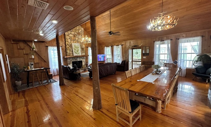 Located in Cut Off, enjoy what this lovely 2-bedroom lodge has to offer. With one full size bath and a queen bed and three full size beds in a Loft bedroom, guests can relax in this cozy space equipped with heating, a fireplace, outdoor screened area and boiling room, front porch swings, games and beautiful oak trees, and Wi-Fi. Experience the magic of Cut Off at our lodge.