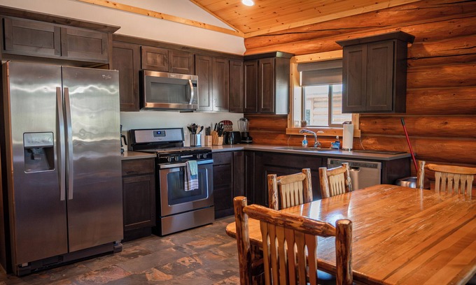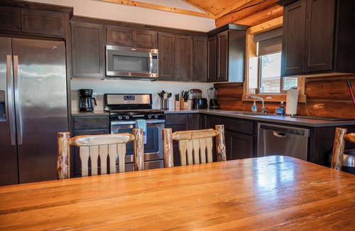Thoughtfully furnished and fully equipped, the cabin features a spacious living area with sofa sleeper and a flat-screen TV, a dining space for family meals, and a full kitchen stocked with dishes, cookware, and appliances to make you feel right at home. The master bedroom is designed with your rest in mind, with soft linens, cozy robes, and private bathroom for added comfort. The bunk room sleeps 4 with an additional full bathroom just outside the door.