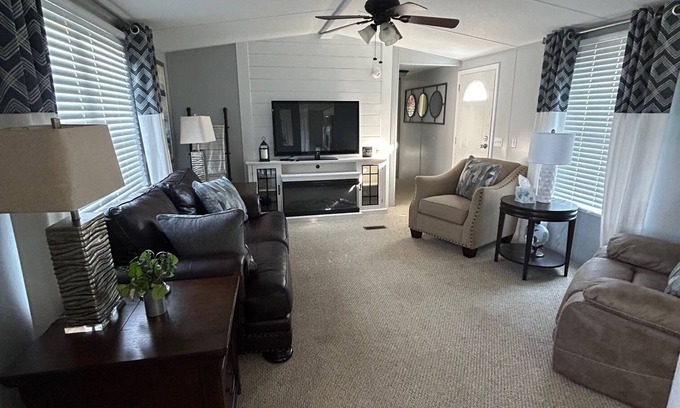 Step inside to a warm, inviting space that's been thoughtfully arranged for both relaxation and practicality. The layout is all on one level, with a mix of luxury vinyl plank, tile, and soft carpeting where it matters most. The living room is cozy and stylish, featuring a plush sofa, a TV, an electric fireplace, a coffee table, and a ceiling fan to keep things cool. It flows into a dining area with a table that seats four comfortably, which is excellent for dinner nights.
