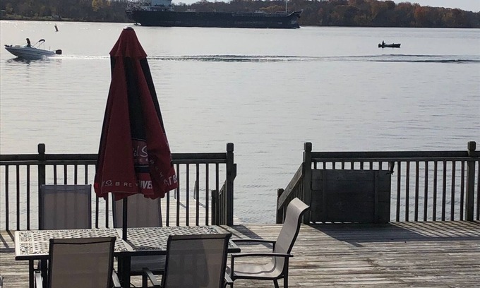 This cozy 2 bedroom cottage is situated directly on the St Lawrence Seaway. Enjoy stunning views of endless ships passing by. Fantastic swimming with direct, private water access. World class fishing is right in your backyard. Sit and enjoy the views in a 10 by 25 foot screened in porch or on the 1400 square foot patio that leads to a 6 by 20 foot pile driven dock. Walking distance to 2 local restaurants-The Blue Anchor waterfront bar & grill-Sheep’s Head Bistro.