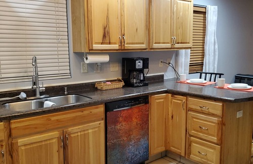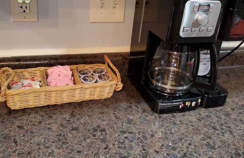 The kitchen has full size appliances, microwave, toaster, blender and pot/ single serve coffee maker with complementary coffee and tea. There is also basic cooking spices, oil, sugar and sweetener and creamer . In the cabinets you'll find a full dinnerware set, flatware set, kitchen knives and kitchen utensils.