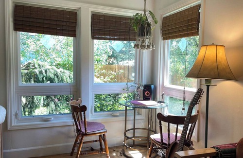 Living room is spacious with ample seating, sofa, wood stove, and piano. Kitchen is well-equipped with high-end coffee grinder and french press. Bathrooms are recently renovated with shower and tub. Two spacious bedrooms, one currently used as an office with day-bed. Attached garage and large fenced in yard for the pups.