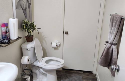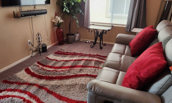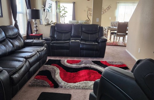 Your luxurious retreat awaits in North Las Vegas at my exquisite 2-story residence featuring a 2-car garage. Unwind in a state-of-the-art massage chair, enjoying your favorite music via Alexa. The property boasts two separate bedrooms (both upstairs)with soothing queen beds, 1 and 1/2 bathrooms, and essential amenities. This ideal getaway is perfect for guests seeking comfort and convenience, located under 25 minutes from various attractions. The area offers numerous eateries and recreational activities. Traveling guests are invited to inquire about nearby venues and recreation. You won't be disappointed!