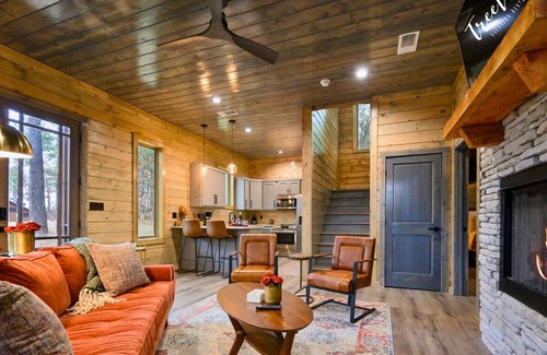 Escape to the woods and unwind at Vintage Pine Cabin, where comfort meets the calm of nature. This charming two-bedroom retreat features two king master suites and a pull-out couch in the lounge area, offering space for up to six guests. Inside, you’ll find cozy living spaces, a fully equipped kitchen, and a fireplace perfect for curling up after a day outdoors. It's the kind of place where mornings start slowly and evenings end around a glowing fire with your favorite people.