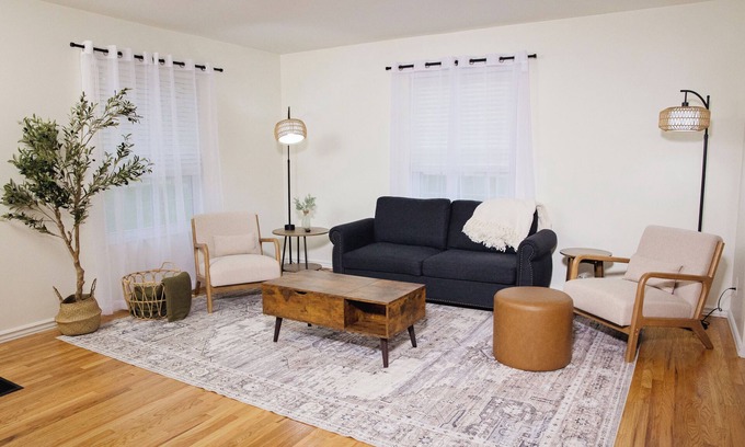 This cozy 2-bedroom apartment has been lovingly renovated to make you feel right at home. Bedroom 1 has a queen size bed, bedroom 2 has a bunk bed with twin mattresses and the living room sofa has a pullout bed. With one full bathroom and everything on a single floor, it’s ideal for anyone who prefers easy access. While there’s no indoor garage access, you’ll have full use of the driveway, patio and backyard. It is a perfect spot to relax and enjoy your stay.