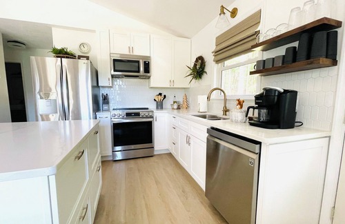 The kitchen (located on the upper level) is equipped with all your basic appliances including a microwave and dishwasher and comes fully stocked with cookware, utensils, plates, etc. You'll find most of your basic kitchen necessities like paper towels, dish detergent, trash bags, are included as well.