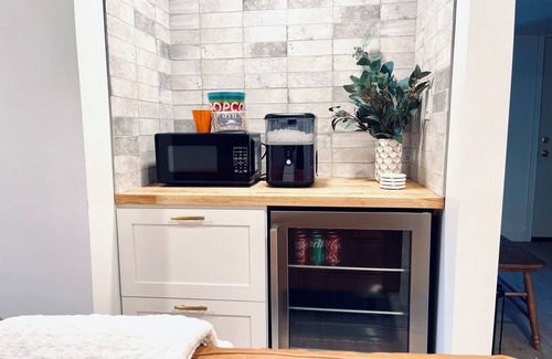 The upstairs living room has a cozy, propane fireplace and is furnished with a 55" Fire Television for enjoying access to Netflix, Amazon Prime, and Disney+. Our lower-level living area offers a 65” Roku tv and comfy lounging sofa for more of a movie room experience. Our snack niche has a beverage cooler, microwave for popcorn, and nugget ice machine for the enjoying all the extras with a show!