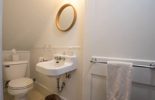 The full bathroom is on the first floor and has a large shower stall. Shampoo, conditioner, and soap are provided. The second half bath is located at the top of the stairs.