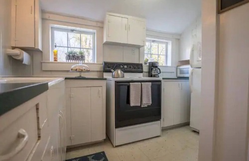 The kitchen is outfitted with the basics for cooking – pots and pans, dishes, cooking utensils, spices and cooking oil. A deep, antique farmhouse sink adds to this quaint country kitchen. Full-sized fridge, electric oven, coffee maker, microwave and toaster round out the appliances.