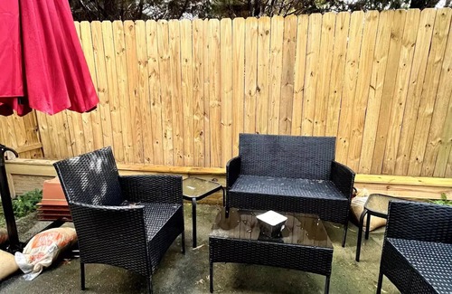 The living room, kitchen and backyard space are downstairs and has a half bath available for use. Enjoy a beautiful day outside in a small fenced patio equipped with a sun umbrella and seating.