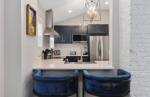 The interior of the home has been recently updated with modern finishes and stylish decor. The living and dining area is perfect for relaxing or entertaining guests. Dine out at the top restaurants located in our downtown, within a short walk, or prepare your own meals in the fully equipped kitchen featuring all new appliances. Essentials include dishes, cookware, a blender, a toaster, and basic coffee service.