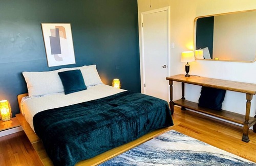 This cute 3-bedroom home offers several sleeping options for guests. The largest bedroom features a queen-sized mid-century modern bed, providing a comfortable and elegant space to rest and recharge. The additional rooms are equipped with a cozy queen-sized bed and twin size bed respectively, ensuring a good night's sleep for all. With its diverse sleeping options, this home is the ideal choice for families, groups, or anyone looking for a comfortable and accommodating place to stay.