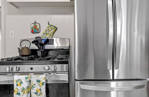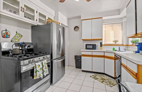 The house is on a quiet block with its own private driveway. There’s a convenient self check in keypad. It’s spacious enough to accommodate a family. There are 3 bedrooms: 1 Queen bed upstairs, twin bunk beds in the second bedroom, and 1 twin bed in the third bedroom.