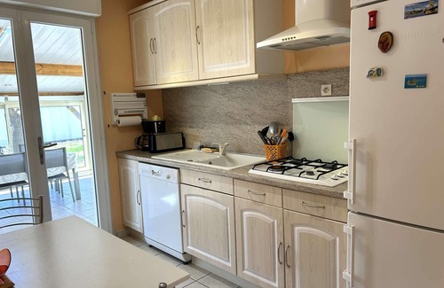 Les Plus de cette location à la mer : Dans un quartier calme et pavillonnaire, vous apprécierez la grande véranda avec mobilier de jardin, une terrasse, transats et barbecue, Ménage de fin de séjour inclus