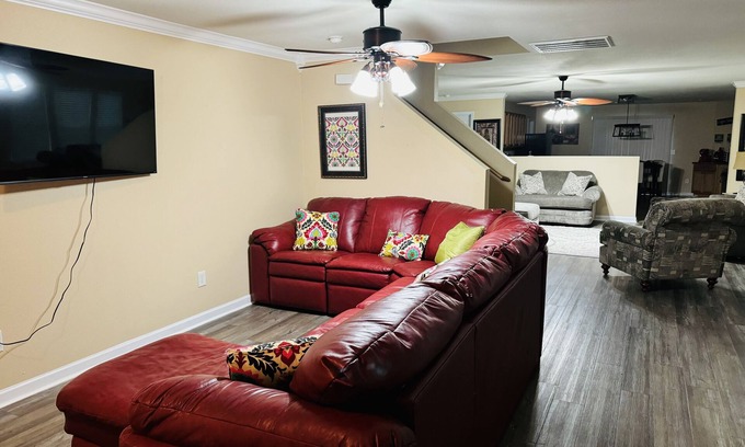 This home is 2-10 minutes distance from a number of shopping, gas & grocery centers, restaurants, Memorial Parkway, downtown Huntsville and I-565. When you step into this stunning home, you're greeted by a stylish, spacious open floor plan with two huge living areas, two 65" televisions, a workstation and full-service kitchen. Each relaxing bedroom comes with smart TV's, walk-in closets, and workstations. Have some joyful fun in the game room, equipped with 2 arcade style console games with over 25 classic video games, pool table, darts, Jenga, Connect 4, and more.