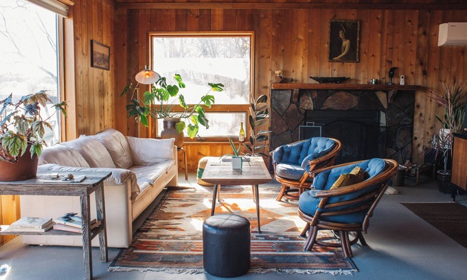 The cabin's design imitates nature with its high ceilings and large windows, filling the space with natural light and immersing you into the surroundings. There is one bedroom with a queen sized bed, one bathroom, and a full kitchen. The furnishings pay homage to the simple things in life and bring a feeling of modern nostalgia. Drifting your memories to times of summer camp and vacations to the mountains. The living room has a cozy couch, vintage speaker system and a well-stocked bookshelf, encouraging you to sink into the moment by yourself or with someone you love. The wood burning fireplace adds to the ambiance during colder seasons.