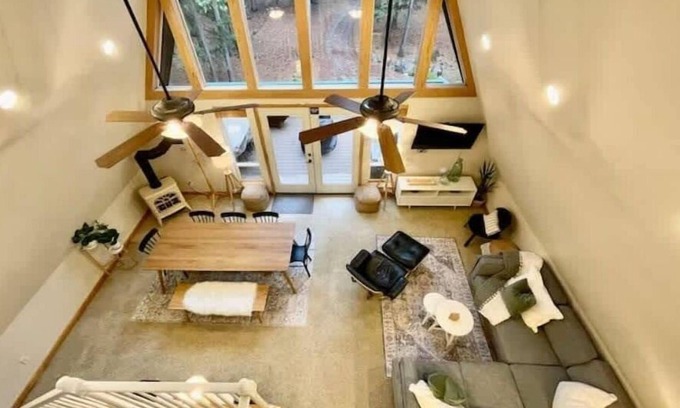 There is one upstairs loft bedroom (queen) and bedding for someone to sleep on the couch downstairs (not a pull-out couch). The loft bedroom has a beautiful view of the floor-to-ceiling windows looking out at the tall pine trees. You will love the sight of the beautiful light streaming through the trees in the morning. The space has been designed to make you feel like you are in a mountain lodge while also highlighting the stunning architectural features of the home. There are plenty of places to sleep if you want to expand your reservation: in total there are three bedrooms: one upstairs in the loft (queen), one bedroom on the main level (two twin beds), one bedroom downstairs (queen bed), a daybed with trundle in the downstairs living room (two twin beds), and extra bedding for someone to sleep downstairs on the couch (not a pull-out couch). A reservation update can easily be made to accommodate more guests to join you.