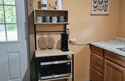 Each bedroom has a queen size bed that have 4 pillows each, an alarm clock that wirelessly charges your phone along with 2 lamps. The kitchenette is economically stocked with cutlery, plates, bowls, cups, various cooking utensils, BBQ utensils, a potato peeler, can opener, pizza cutter, kitchen scissors, mixing bowls, cutting boards, dish drying rack, hand towels, dish clothes, pot holders, a mini fridge/freezer combo, microwave/air fryer combo, keurig style coffee maker, toaster, garbage bags, dish soap, hand soap. The bathroom has a stand up shower that has shampoo, conditioner and body wash, a large medicine cabinet and is economically stocked with bath towels, wash clothes, hand towels, toilet paper, a bath mat, and hand soap. The living room has a couch that comfortably sits 3 adults, a 1 person recliner and a round coffee table. The dining room has a large table with 4 chairs.