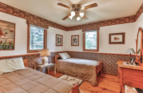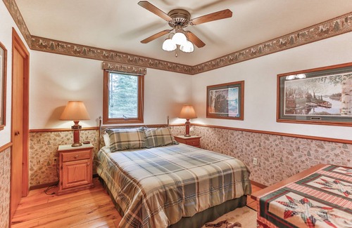 Enjoy the peace and quiet of a private north woods hideaway! Our guesthouse is a fully furnished home away from home with the cozy ambiance of a well-appointed knotty pine cabin. It features two bedrooms, one with a queen bed and the other has two twins. There is a futon in the living room, a single jetted tub, laundry facilities, fully equipped kitchen including coffee and spices, central air, and a three-season porch.
