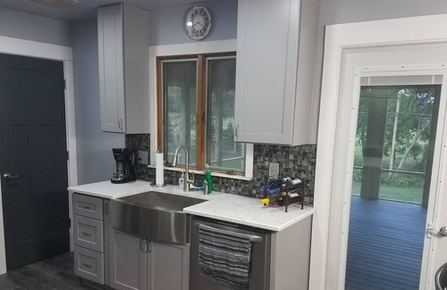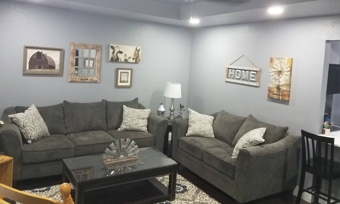 Completely remodeled 1 story, 2 Bedrooms /2 bath ranch house with open floor plan. Handscraped hardwood floors, and porcelain tile throughout, new stainless steel appliances with stainless steel farmhouse sink and quartz countertops. Ceiling fans in all rooms. Raised ceilings in Living and Master ensuite. Tv's in Living and both bedrooms. Free WIFI. Sleeps up to 4. Relax and enjoy the outdoors, indoors with the fiber optic starred ceilings in master and living. Oversized covered in patio overlooking large backyard and open area that is frequented by deer most nights. Asphalt walking path just steps from the back yard. Our home is on a dead end street with very little traffic.