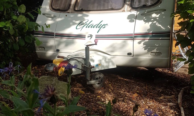 Gladys' is our two berth touring caravan, that we have toured all over the UK in for a few years now. She is pitched in her own private garden of our Edwardian farm house in the heart of the welsh country side. Located on the outskirts of village of llandysilio, Powys, and next to Offa's Dyke Path. Gladys offers a warm and welcome retreat, ideally situated for access to some beautiful walking country. Gladys is a unique holidaying experience on a budget without sacrificing comfort!