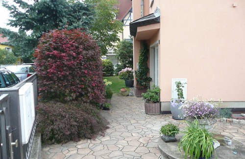 The modern equipped apartment has a successful layout. It is located on the upper floor, in a 2-family house. The property has a parking space for our guests. All around is a lovingly landscaped garden, where you can relax in the shade under a walnut tree from the city stroll. Shops are in the immediate area, about 5 minutes. Gastronomic facilities can be reached on foot in a few minutes. Recreational events are regularly on weekends (Friday-Sunday) at the concert place, in the middle of the forest. Also there is catering with grilled foods, drinks u. a. m. offered.