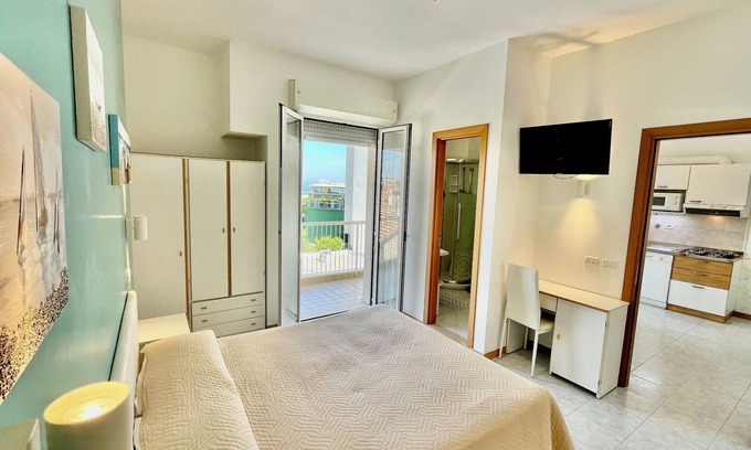 Apartment consisting of bedroom with double bed and single bed convertible into a castle, bathroom and living room with sofa bed and fully equipped kitchen with microwave and dishwasher. Two air conditioners and two LCD TVs. The apartment is inside the Residence Carla, with all the comforts and services offered in the Residence formula and the hospitality and warmth that only a family management for 3 generations can offer. A family-run residence managed by a family that takes care of every detail with love and that will make you find everything you need to enjoy the well-deserved relaxation of your summer holidays. Comfort and practicality await you thanks to all the services offered, fiber WI-FI throughout the hotel, flat-screen satellite TV in every room, microwave, laundry room with 3 coin-operated washing machines, dryer and ironing area, bed linen and towels (with midweek change for towels and once a week for sheets), 1 parking space per apartment in a covered garage 350 meters from the residence, and for small bicycles with child seats, camping beds with linen, high chairs, fall protection rails and reclining strollers that can be booked for free for the duration of your stay. Let's not forget your 4-legged friends, if small pets are welcome!