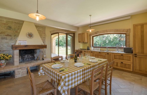 The apartment welcomes you in a fantastic location amidst the Umbrian nature in a restored farmhouse and offers you ideal conditions for a relaxing getaway. The inviting rooms and the stylish furnishings with exposed brickwork, elements of wood and Mediterranean color scheme create a beautiful setting around your vacation. Make yourself comfortable on the sofa after eventful days, chat late into the evening while the flames crackle in the fireplace and make plans for the days to come.