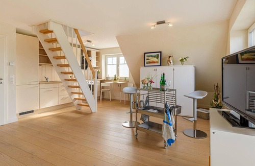 Flat Andreea is a beautiful holiday apartment near the North Sea coast. Lovingly furnished, you will find everything you need for a relaxing holiday on the North Sea coast of Schleswig-Holstein. The open-plan apartment is fully equipped and the comfortable bathroom leaves nothing to be desired. The upper bedroom can be reached via a room-saving staircase. The house is wonderfully situated on the edge of the village, just a few hundred metres from the Bordelumer Heide and Langenhorner Heide nature reserves. The surrounding area is ideal for long bike rides and walks. From the large balcony you have a fantastic view of the countryside. There is enough space to have breakfast with the whole family in the fresh North Sea air or to sit comfortably in the evening.