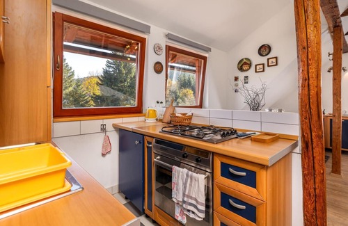 You'll feel like you've stepped back in time as you make yourself comfortable in this holiday apartment. Exposed wooden beams and an inviting wood-burning stove create a cosy ambience ideal for sociable games evenings or relaxing hours after a long day in the fresh air. The open, well-equipped kitchen offers you the opportunity to prepare local specialities together, which you can then enjoy with a view of the countryside.