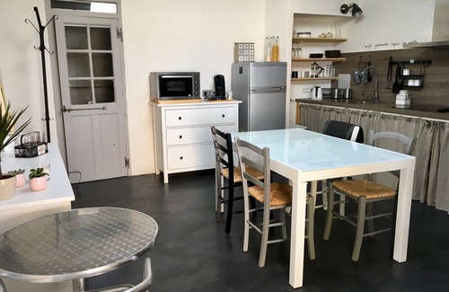 The kitchen is equipped with a large fridge-freezer, a washing machine, an oven, a hood, stoves, pots and pans, crockery, storage, an extendable table with chairs, a bar table Movable outside, a three-seater Provencal chair, a senseo coffee machine, a kettle.