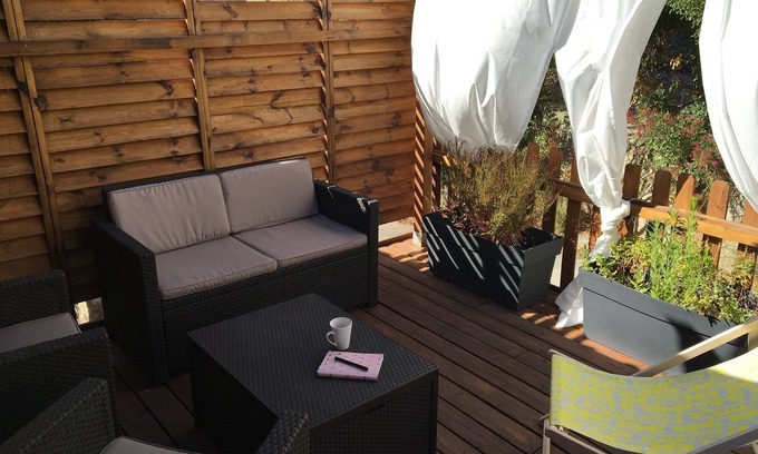 The wooden terrace is composed of a garden furniture and a deckchair where you can relax. It is shaded by curtains which also offer a space of privacy.