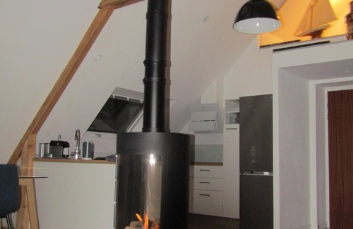 Living room with high ceilings with exposed beams and with a gas stove, with sofa bed.