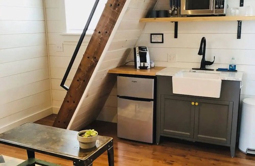 The kitchenette has a farmhouse sink, Keurig (coffee essentials included - coffee k-cups for your first morning, sugar and cream), mini-fridge with freezer, microwave, wine/water glasses, and mugs. (PLEASE NOTE: We do not allow any additional outside appliances. No exceptions. If you are planning to save money by cooking in - this isn't the rental for you.)