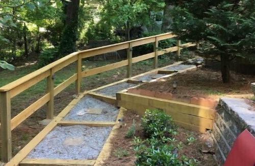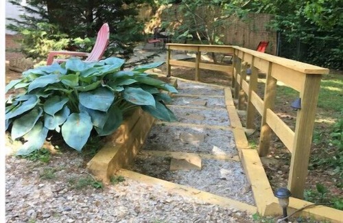 In the back, off-street parking with landscaped outside lighted stairs, to the left, leading to the private entrance/red door, below. The property is not wheelchair accessible.