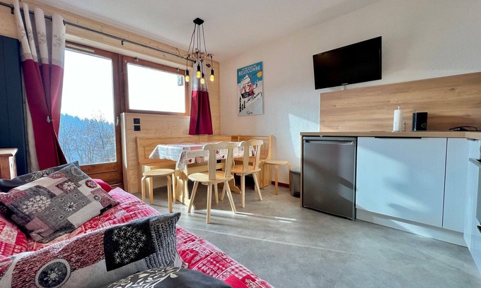 In the village of Notre Dame de Bellecombe, 27sqm apartment for 4 travellers. Located on the ground floor, it benefits from a south-west terrace with a view of the forest and the surrounding mountains.