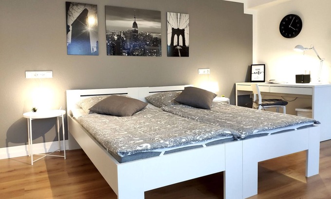 The approximately 25m² studio apartment is equipped with a double bed (consisting of two single beds), fully equipped kitchenette, Smart TV for Netflix & YouTube, a cozy seating and dining area, fast Wi-Fi, Alexa voice assistants, hair dryer, iron and much more. You can park for free right in front of the house and check in to the apartment at any time with the help of a key safe. The apartment has a separate entrance separate from the rest of the house.