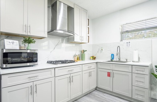 Fully Equipped Kitchen: Cook up your favorite meals in the open kitchen, complete with stylish brand-new cabinets, modern appliances, ample food storage, and a well-stocked coffee station with honey sticks and a variety of teas to enhance your mornings.